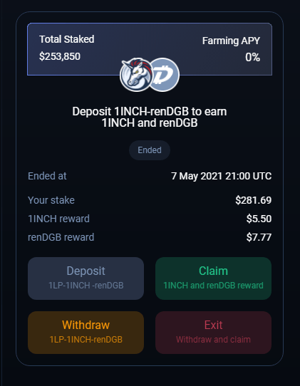 I had put some 1Inch and renDGB in a swap pool on 1Inch in order to take advantage of some staking rewards. Over the month or so the pool was being promoted, it got the rewards listed as advertised (about 50% APY over the month).