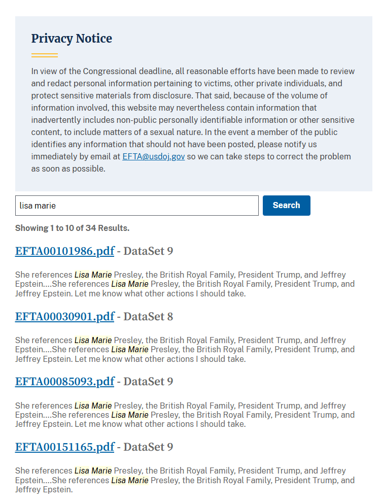 Two of those results are this thirty-page book on her dad, Elvis Presley (YES, Elvis is in the Epstein Files!)