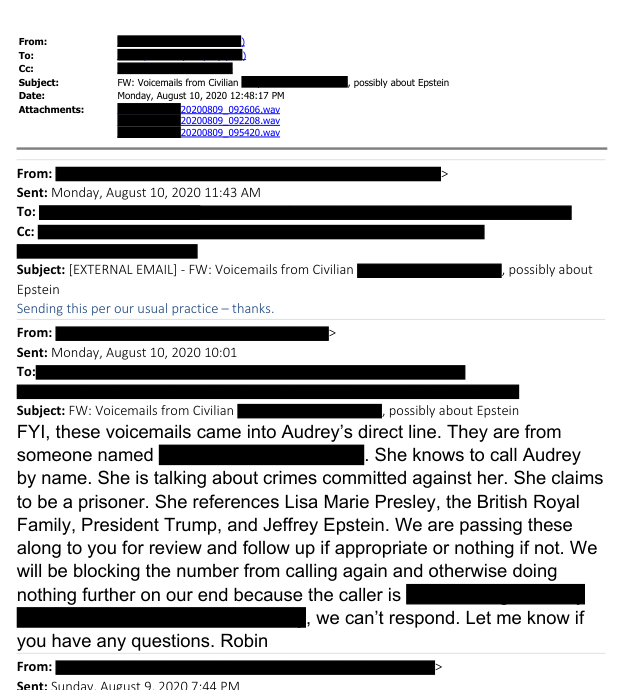 We also see here the (quite common) issue of inconsistent redactions. We now the caller (she) knew to call “Audrey” by name. We know that this came from “Robin.” We also see the redaction of the caller’s location, which we can see, unredacted, in the email above.