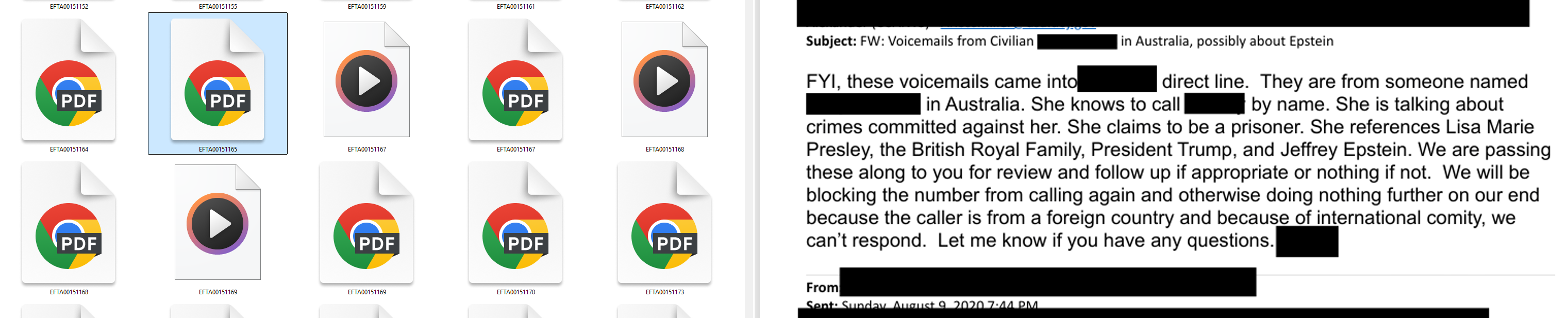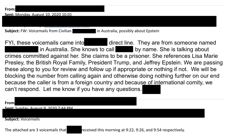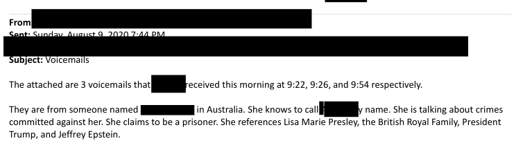 We also see here the (quite common) issue of inconsistent redactions. We now the caller (she) knew to call “Audrey” by name. We know that this came from “Robin.” We also see the redaction of the caller’s location, which we can see, unredacted, in the email above.