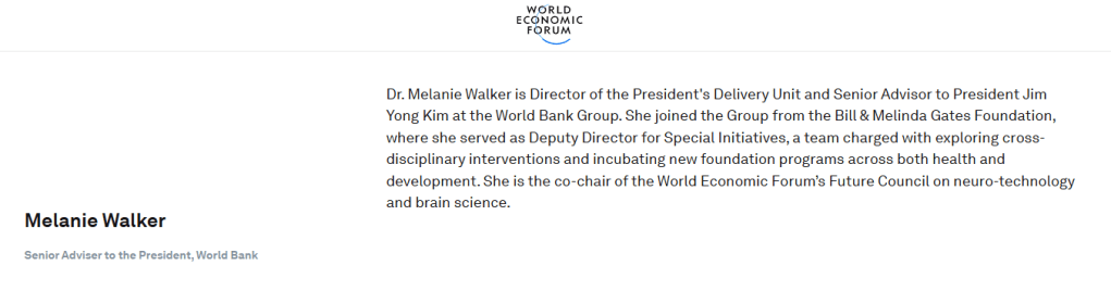 She is also a member of the World Economic Forum. “Senior Advisor to the President, World Bank”.