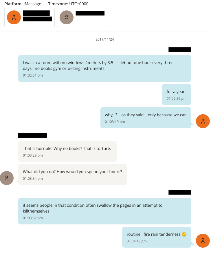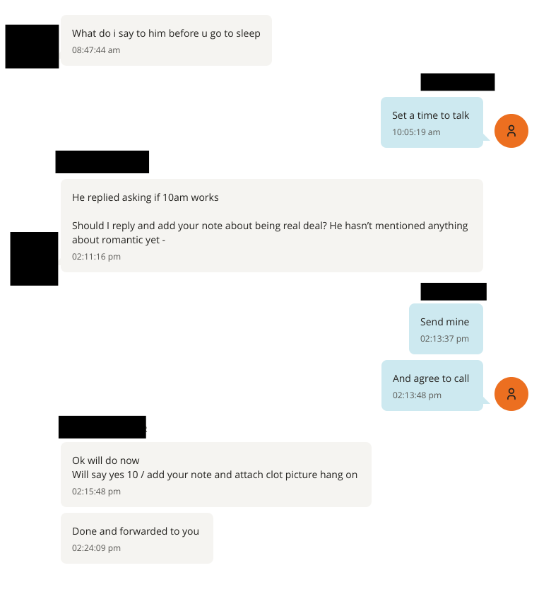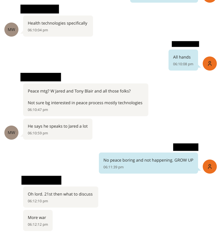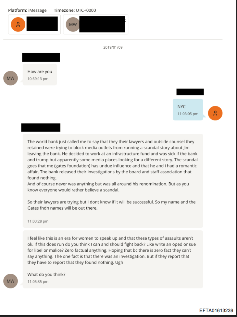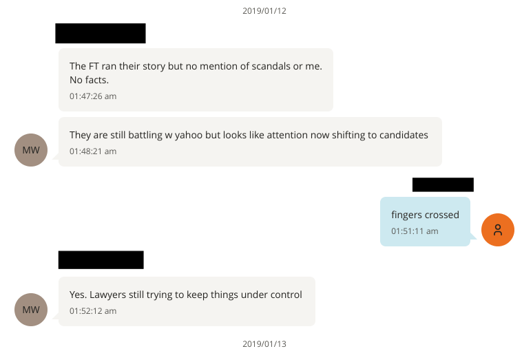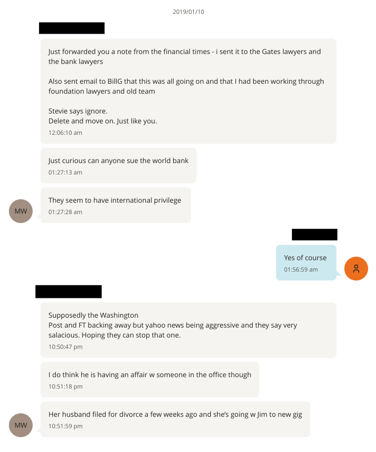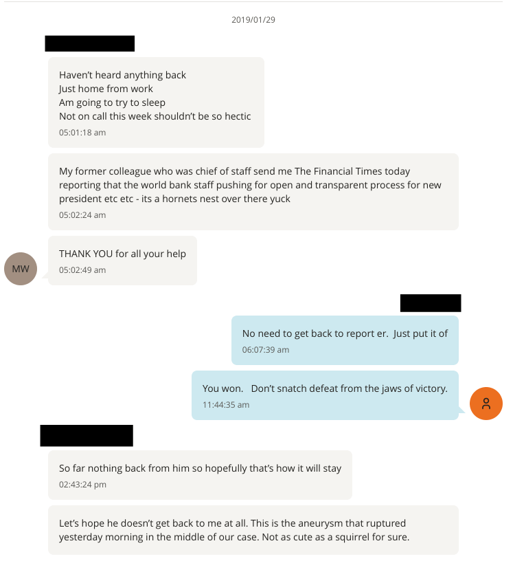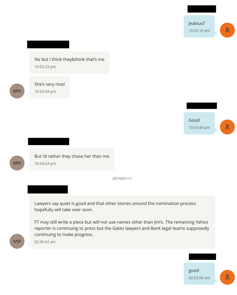 …which are a MUCH easier format to consume than email chains where each email is printed out. I noticed some very juicy chats with someone who had the initials MW (they are often redacted, but sometimes not). Also, relative locations are mentioned. In one particular chat those fateful words (“call me”) are followed by a number of un-redacted digits. Those digits and google led directly to the first MW.