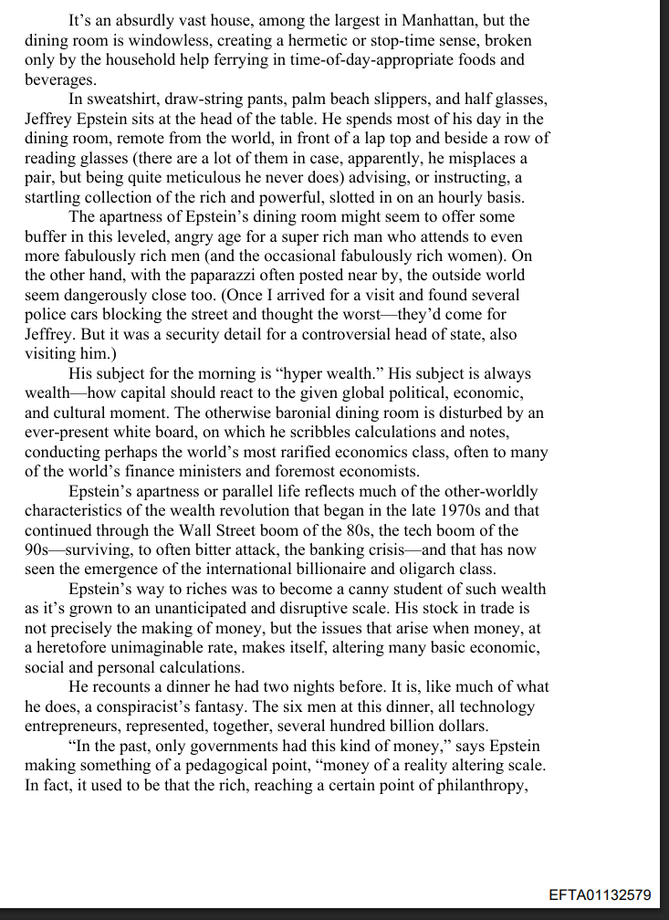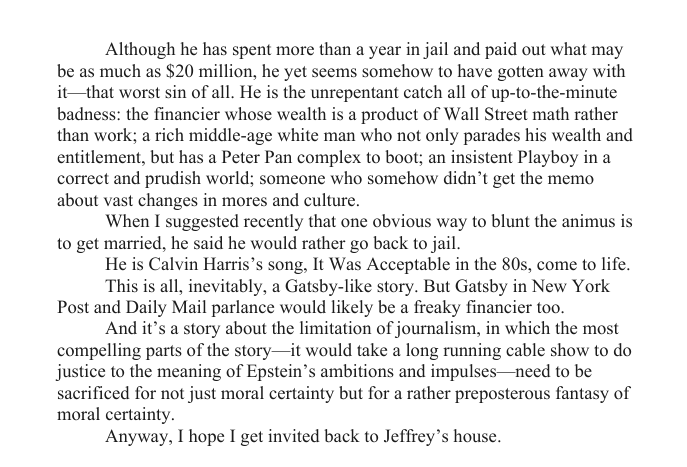 Finally, for Wolff, we have an excerpt of his book on Epstein. After all those interview and all that time spent with him (*cough*) we have a profile built.