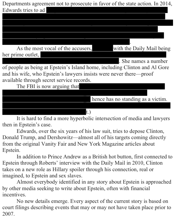 Available to the public via the DOJ via Document ID 1132579 (and a couple other places*) at 19 single-spaced pages, it’s a drudge to get through and needs some serious editing. However, this is a pretty deep and thorough dive into Epstein’s background, business, and present circumstances.
