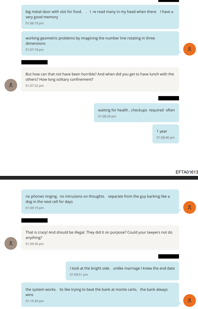 And then Gatsby was killed in prison, so the story goes. I think. It’s hard to imagine someone goes from “Tell Bill Gates he *owes* me a call.” to killing themselves with a bedsheet. Indeed, Epstein himself documented his feelings about his first prison term (Document ID 1613696).